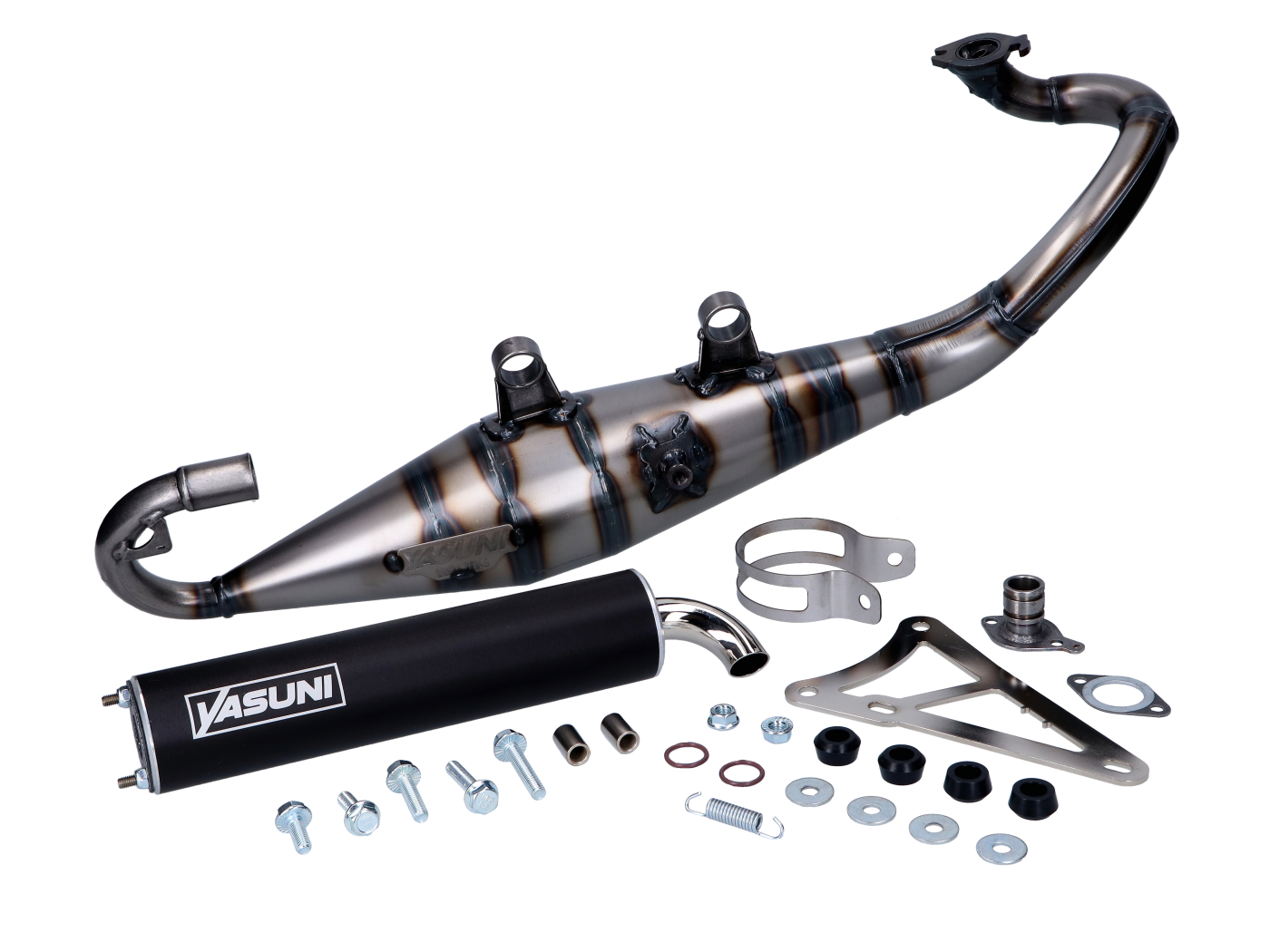 Visoko zmogljiv izpuh Yasuni R-PRO s črnim dušilcem primeren za skuterje z vodoravnim Minarelli motorjem.