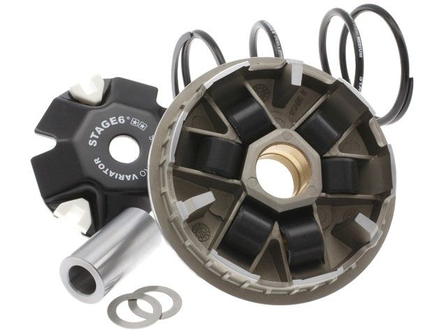 Variomat Stage6 pro za modele s peugeot horizontal ali vertikal agregatom je popolna novost na trgu delov za skuterje. Variomat je namenjen za 50cc skuterje, ki imajo menjan izpuh z resonančnim, kot je naprimer izpuh Stage6 Pro Replica. Vsekakor variomat deluje tudi s sport 70cc predelavami, kot je naprimer motor z cilinderkitom Streetrace. Komplet variomata ima priloženo povratno vzmet srednje trdote in komplet uteži variomata dimenzije 16x13mm, teže 10.0g.