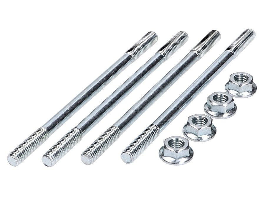 Komplet stojnih vijakov, vključno s posebnimi maticami z navojem M6 za cilinder, primernim za motorje Piaggio, Puch Maxi, X30 in druge modele s vijaki za cilindre M6. Priložen je komplet s 4 vijaki in 4 posebnimi maticami. Vijaki so dolgi 107 mm, matice imajo obrobo.